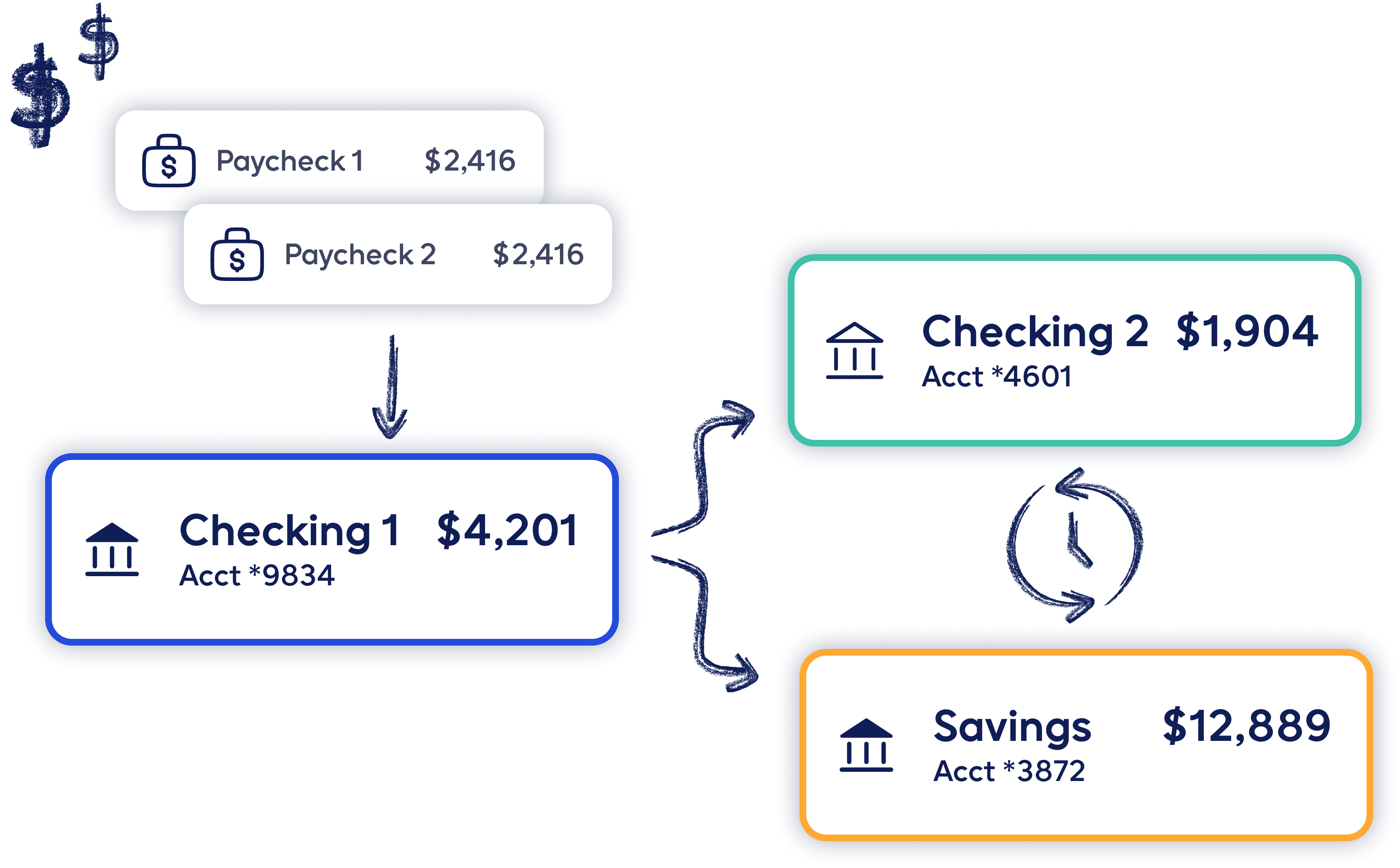 Deposit paychecks into your Upcoming account, then put your budget on auto pilot by setting up recurring transfers to the Saved and Everyday accounts for what you need to spend (or save) money on.