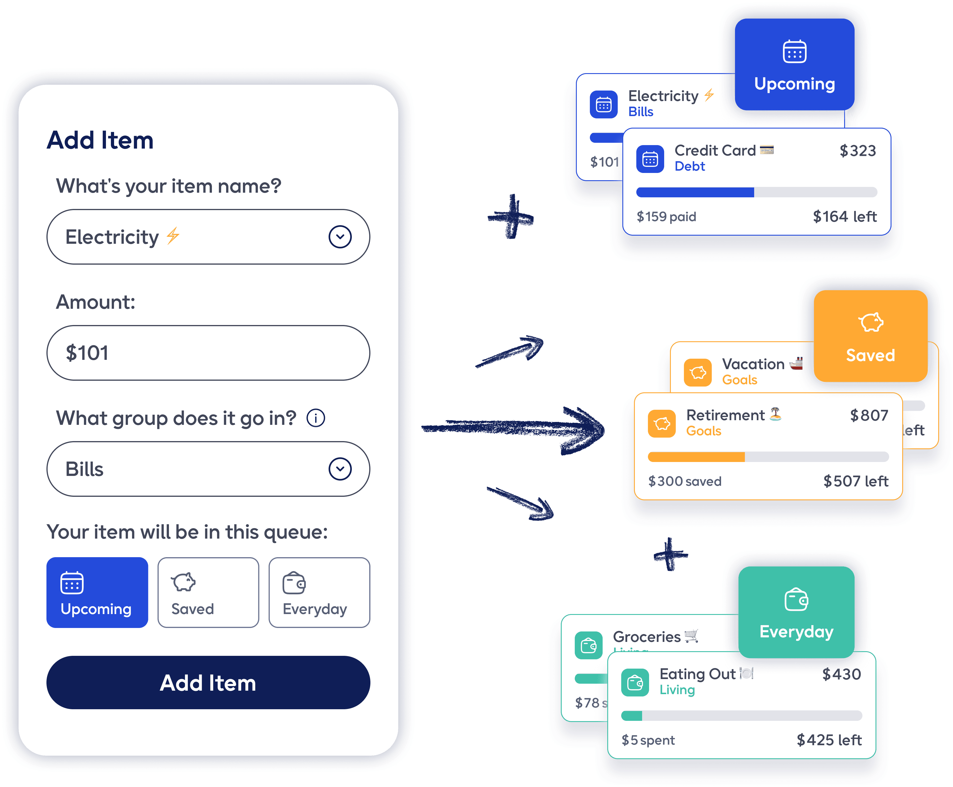 Each item gets assigned to a group (bill, debt, goal, or living) to build a balanced plan, as well as a queue to help you manage your spending.